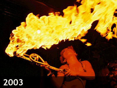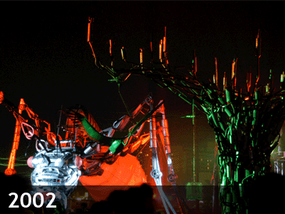 この年、入場ゲートには枯山水が作られ、アーチ型の橋が架けられ、ニワトリは巨大ゴリラに変異し、巨大トンボが宙を舞った。オーストラリアからやって来た強者による、400万ボルトの電気を発するライトセイバーでエレクトリック・バトルや、12メートルの高さを誇る噴水と火柱で観る者を魅了するFeuerwasserがアリーナを席巻した。そして今となってはクリスタルパレスはミュージシャンやアーティストがプレイしたいと思う場所になった。金曜日はSeasick Steve, Trave-Wrappin, Flying Padovani。土曜は超ファンキーなMocha Mountain Kilimanjaroに始まりCumbia Kid, Big Willie’s Burlesque, Jim Westが盛り上げ、極めつけは何と言ってもGogol Bordelloの圧巻なパフォーマンス。テントが揺れて崩れ落ちそうな程の盛り上がりをみせた。日曜はシーナ&ザ・ロケッツがロックに、PinchやTomi the Jazzy Monkはレアグルーヴやジャズでフロアーを揺らし、JVC Forceとゴージャスなベリーダンサー達による怒濤のパフォーマンス。最後は例年通り、Sim Cassによるダブ・セットで日曜日の甘い夜を締めくくった。太陽が昇っても外では興奮冷めやらぬGogol Bordelloがバスキングし、2重に架かった虹に人々が歓喜した!