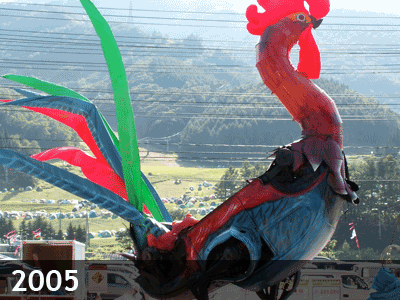 酉年ということでジョーはフォルクスワーゲンをベースにした巨大ニワトリを作り上げ、恐竜はコンテナの上にそびえ立った。前年同様円形サーカス・テントが設置され、Gideon Bergerによって鮮やかな赤いベルベット仕様の豪華な内装が手がけられた。東京クラブシーンの伝説ともいわれるロンドン・ナイトとクラブ・スカのトップDJ陣がプレイし、スカ・クバーノやキッドカーペットがエネルギッシュなライブを披露した。それに加えノーマン・クックが急遽飛び入りでDJをし、Big Willie’s Burlesqueはセクシーな女性ダンサーと共に、観る者を魅了した。アリーナではJean Montiは高さ42メートルもの目眩のするような高さまで登り、霧雨まじりの突風の中で片手で逆立ちするという息をのむようなパフォーマンスを綱渡りと共に見せてくれた。一歩間違えたら命も落としかねない、まさに見る者を魅了する「神業」であった。